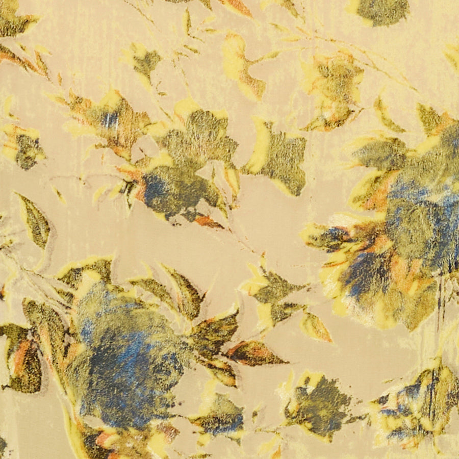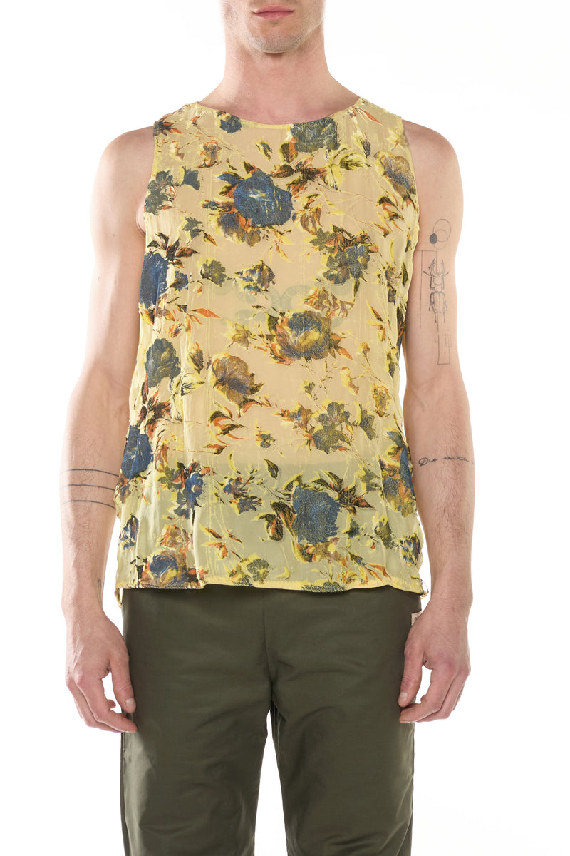 - Handcrafted tank top in yellow silk devoré velvet. The refined, luminous fabric, featuring a raised floral motif, gives the piece depth and movement. The relaxed fit and sheen of the velvet make it perfect for a refined yet casual style.