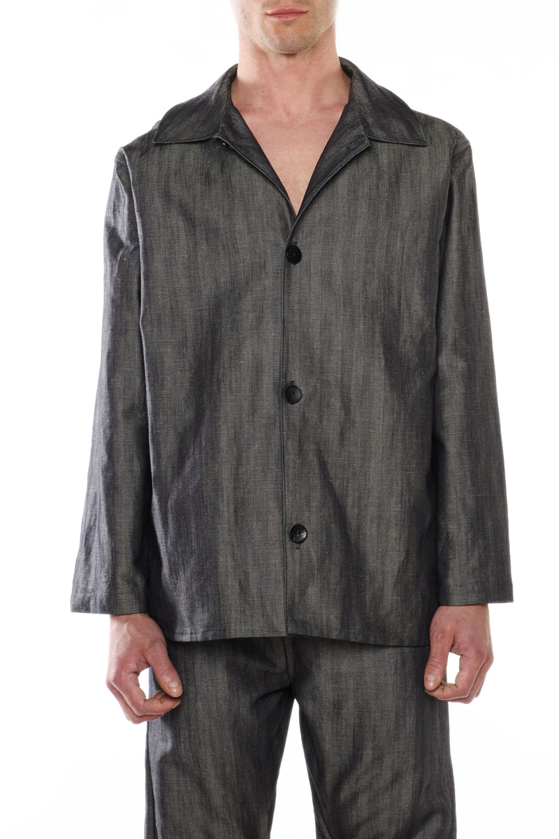 - Handcrafted shirt jacket in blue cotton herringbone denim. The clean lines, oversized fit, and herringbone pattern with thin vertical stripes lend the piece a distinctive, casual elegance. The convertible collar adds versatility, allowing it to be worn fully buttoned or with the top button undone.